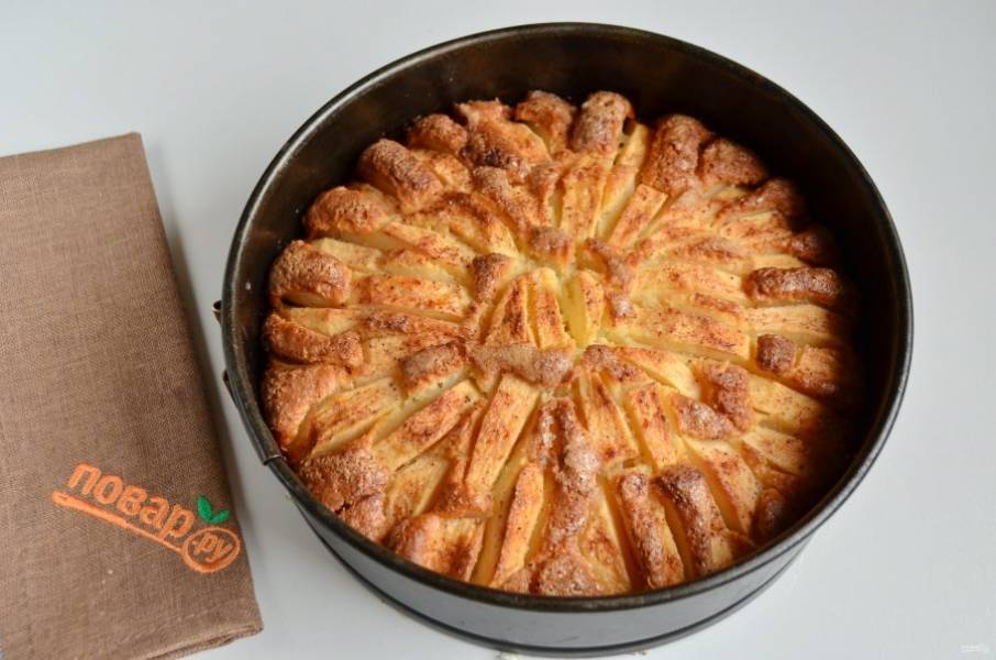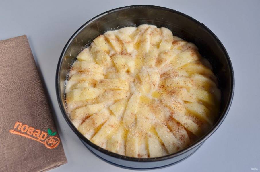 7. Полейте яблоки растопленным маслом (оставшейся половиной), посыпьте сахаром и корицей. Отправьте пирог в горячую духовку (180 градусов) на 35 минут.