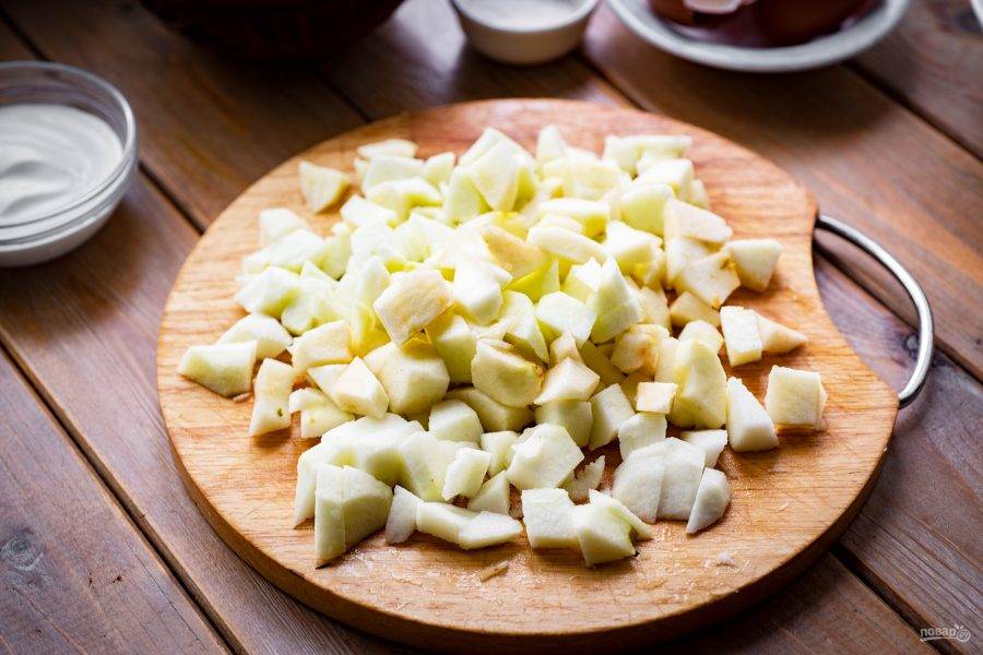 С яблок снимите кожуру, удалите семенные отделы, мякоть нарежьте небольшими ломтиками произвольного размера.