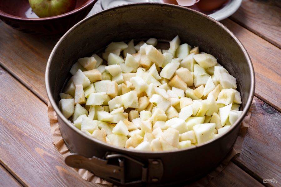 На дно формы, застеленной пергаментом для выпекания выложите 2/3 всех яблочных ломтиков, распределяя равномерным слоем.