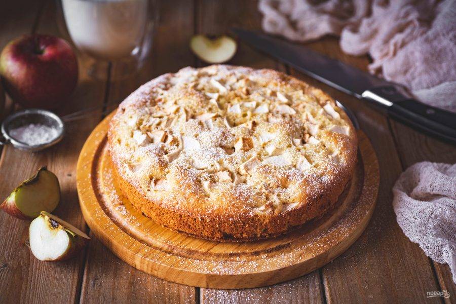 Готовый пирог немного охладите, присыпьте чуть сахарной пудрой и подавайте к столу.