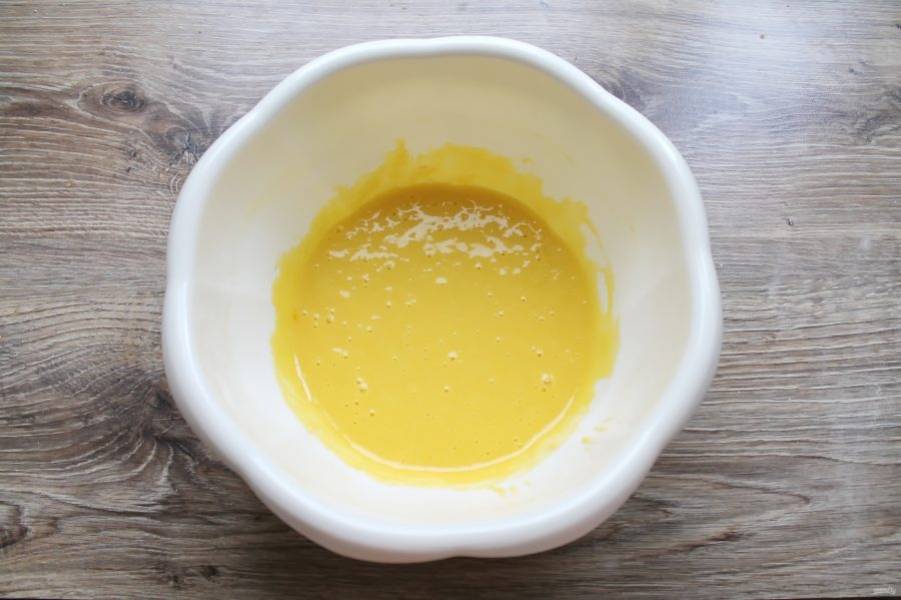Включите духовку разогреваться до температуры 180 градусов. В миску вбейте яйца, добавьте сахар и взбейте венчиком.