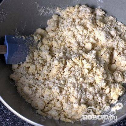 2. Приготовить тесто. Смешать вместе муку, сахар, соль. Добавить нарезанное на куски сливочное масло и перемешать ножом для теста или в кухонном комбайне. Выложить смесь в большую миску. Взбить 1 яйцо и молоко в миске, добавить в мучную смесь и размешать до однородности.