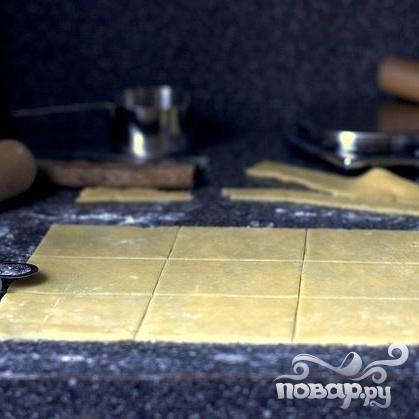 4. Раскатать каждую половину в прямоугольник размером 22Х30 см и толщиной 3 мм на посыпанной мукой поверхности. Разрезать каждый прямоугольник на 9 прямоугольников. Взбить яйцо и смазать поверхность теста.