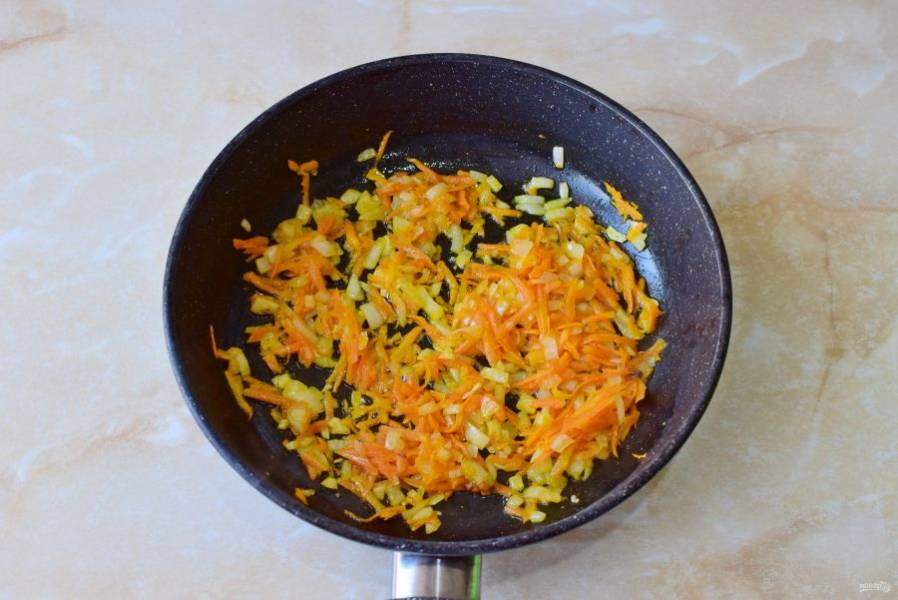 В это время можно заняться приготовлением начинки. Если в сладком варианте можно взять готовый джем, то для не сладкого варианта капусту надо приготовить. Обжарьте 3-5 минут измельченные морковь с луком.