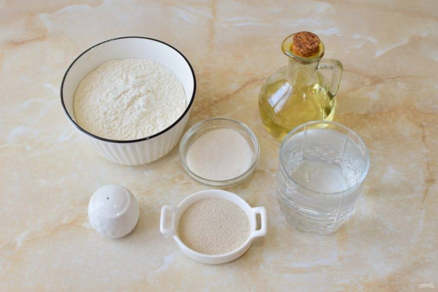 Чтобы приготовить дрожжевое тесто на воде, подготовьте необходимые ингредиенты. Муку заранее просейте через сито, чтобы насытить её кислородом. Воду нагрейте до теплого состояния.