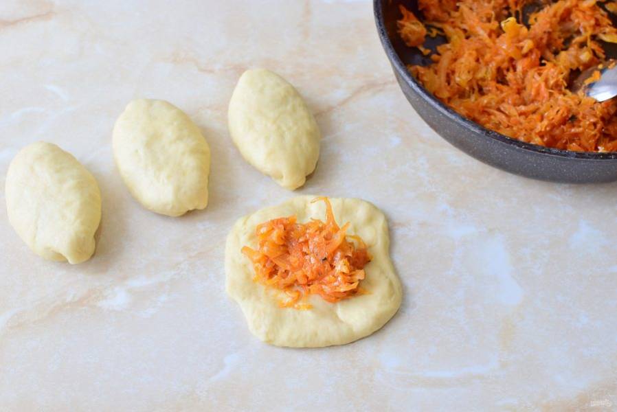 Из теста формируйте небольшие лепешки, выкладывайте начинку и формируйте пирожки.