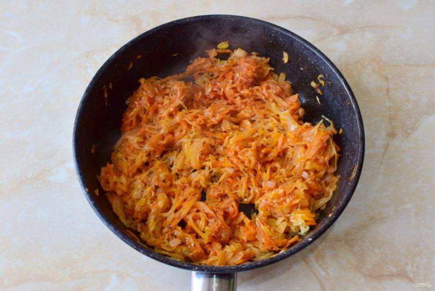 Затем добавьте в сковороду нашинкованную капусту и немного воды. Тушите капусту под крышкой, помешивая, 15-20 минут. По вкусу подсыпьте соль и специи.