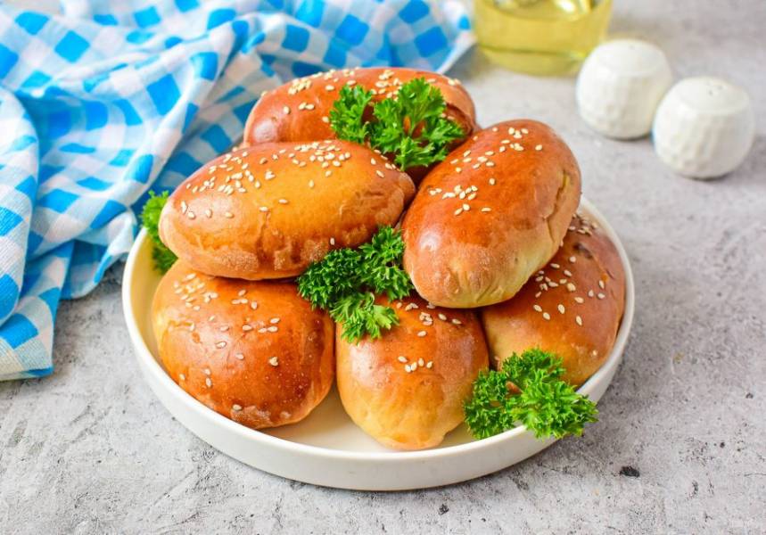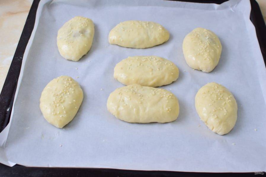 Выложите пирожки на противень. Верх можно смазать желтком или молоком и посыпать кунжутом. Готовьте пирожки в духовке при 180 градусах, примерно 12-15 минут.