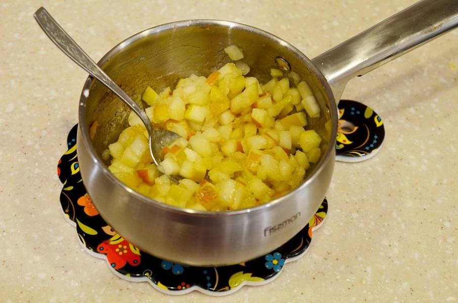 Для начинки яблоки нарежьте кубиком и потушите вместе со сливочным маслом и сахаром до мягкости.