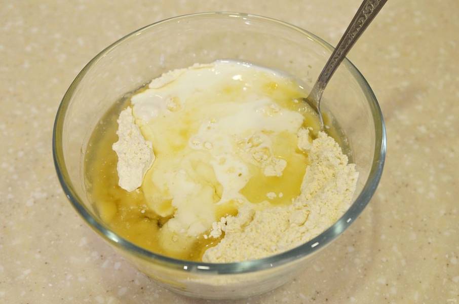 Смешайте муку, разрыхлитель, сахар, соль и дрожжи - дождитесь реакции.