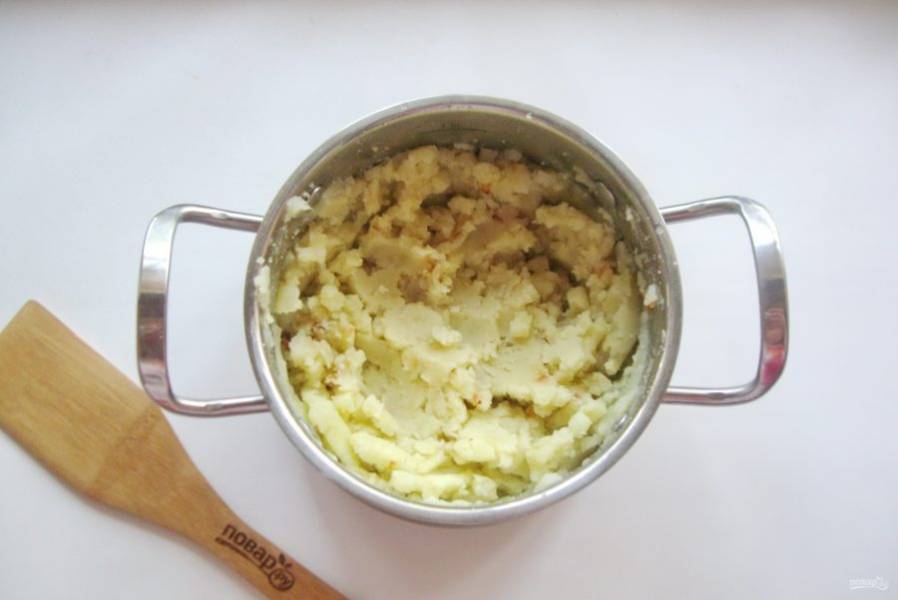 Приготовьте начинку для пирожков. Картофель очистите, помойте и выложите в кастрюлю с подсоленной водой. Варите до готовности. После воду слейте, а картошку разомните в пюре.
