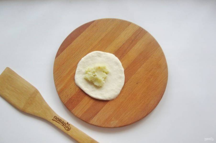 Каждый шарик раскатайте в лепешку. На лепешку выложите начинку.