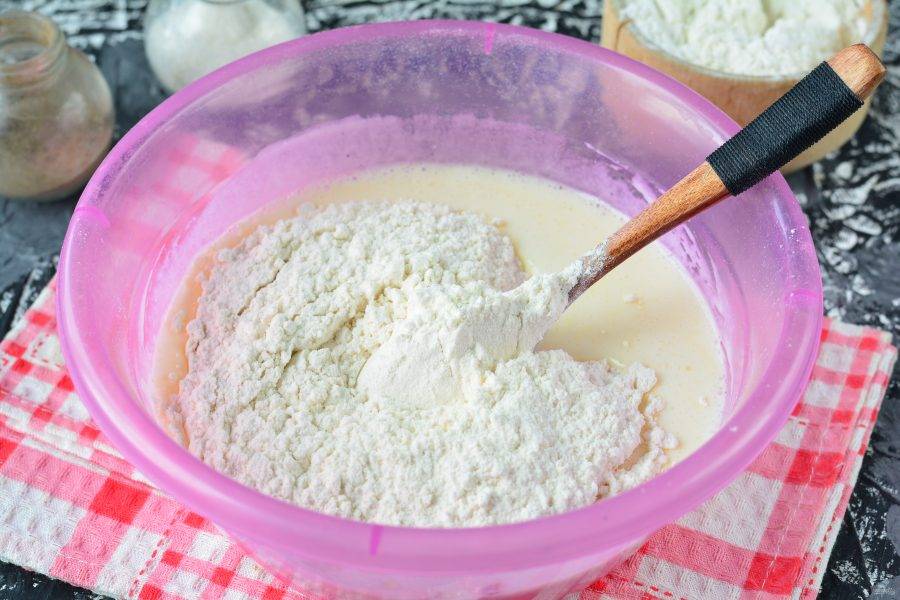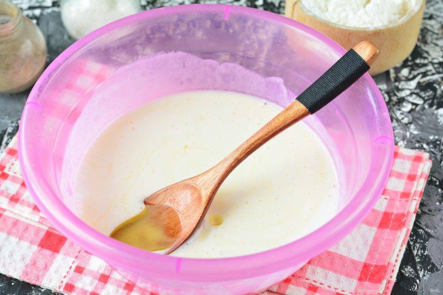 Влейте пару ложек масла в тесто, взболтайте. Всыпьте немного соли.