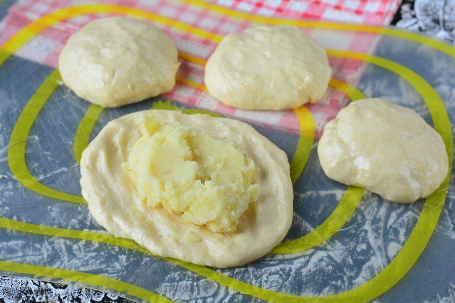 Каждый шарик расплющите ладошкой, выложите в центр картофельную начинку, примерно 1-1,5 ст. л.