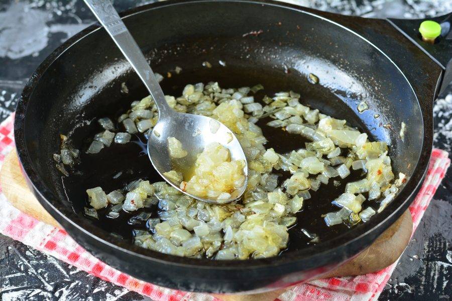Нарежьте кубиками лук, обжарьте на сковороде с растительным маслом (2 ст.л.), пока не подрумянится.