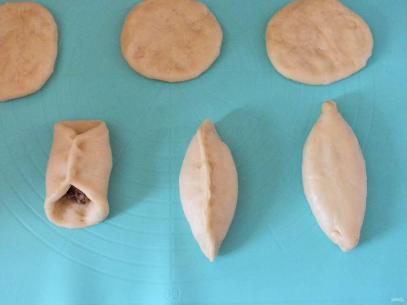 Из каждой части сделайте лепешку, выложите столовую ложку с горкой начинки и слепите пирожок. Тщательно скрепляя шов.
