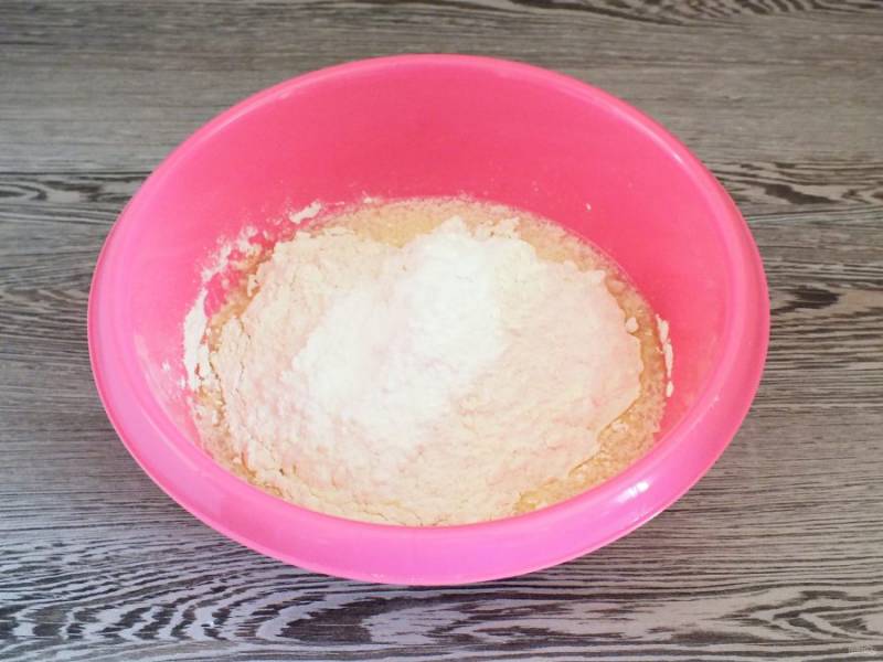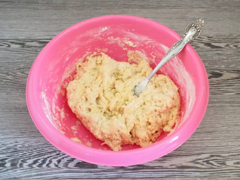 Замешивайте вилкой. Когда трудно станет перемешивать, начните месить руками.