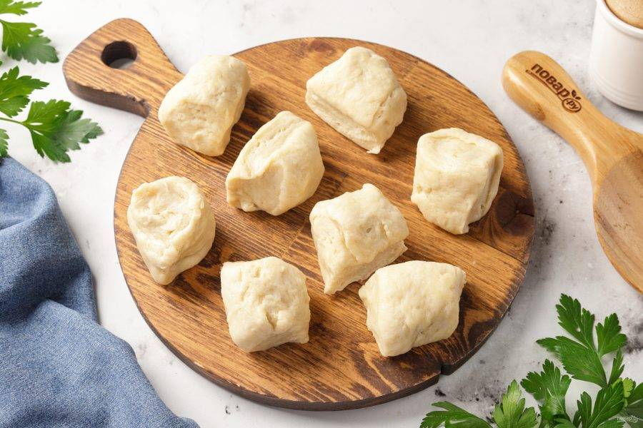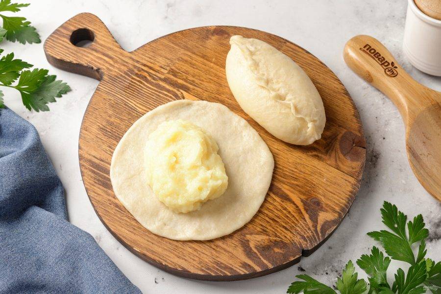 Каждый кусочек примните руками и раскатайте в форме круга. Выложите в центр начинку и плотно защипните края, формируя пирожок.