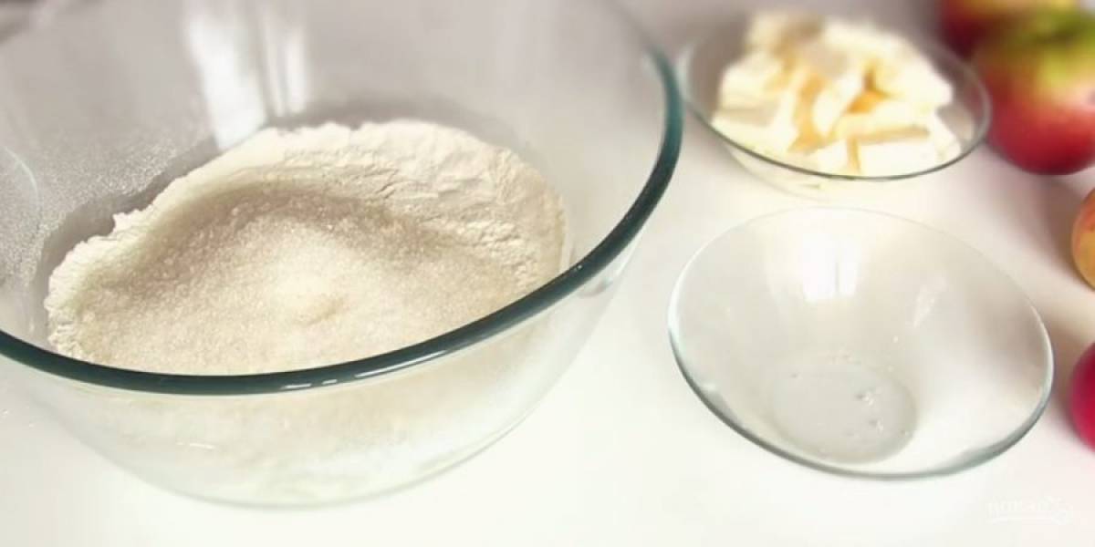 1. Просейте муку, смешайте её с сахаром и солью. Добавьте нарезанное небольшими кусочками холодное сливочное масло и перетрите тесто до состояния крошки.