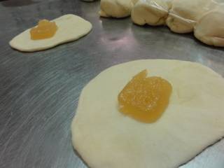 В серединку каждой лепешечки выкладываем джем. Если джем жидковать, можно в него добавить немного крахмала.