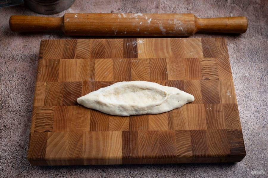 Отделяйте от общей массы теста небольшие части (у меня вес одной части 60 грамм) и формируйте лодочки как на растегаи.