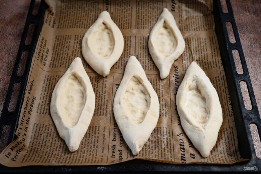 Все заготовки-лодочки из теста выложите на противень, застеленный пергаментом для выпекания.