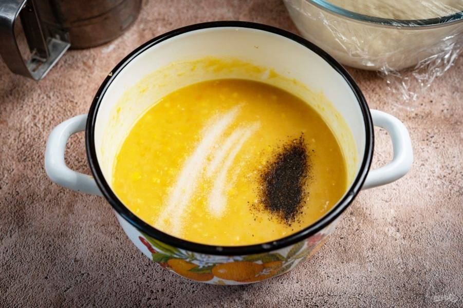 К этим ингредиентам залейте теплую воду и венчиком размешайте до полного растворения дрожжей.