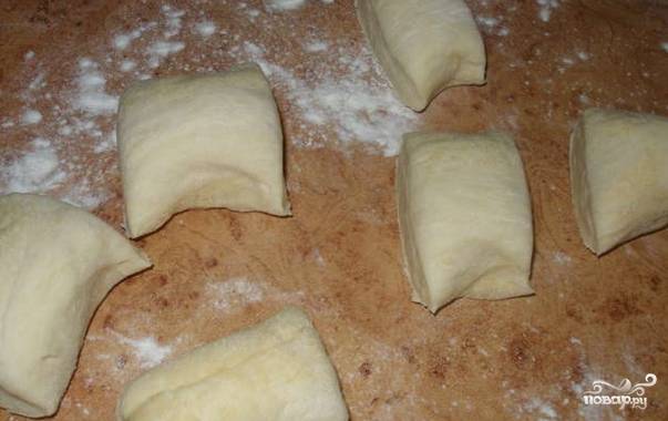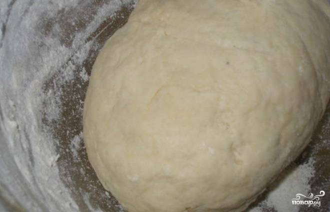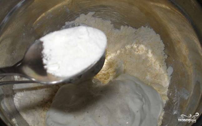 Добавьте разрыхлитель, сметану, оставшуюся муку и замесите тесто.