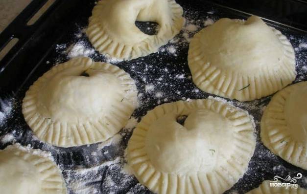 На присыпанном мукой противне выпекайте пирожки в течении 20-25 минут. Температура духовки – 180 градусов. Приятного аппетита!