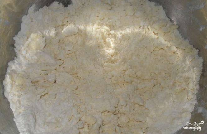 Нарезанное кубиками мягкое сливочное масло разотрите в мисочке с одним стаканом муки.