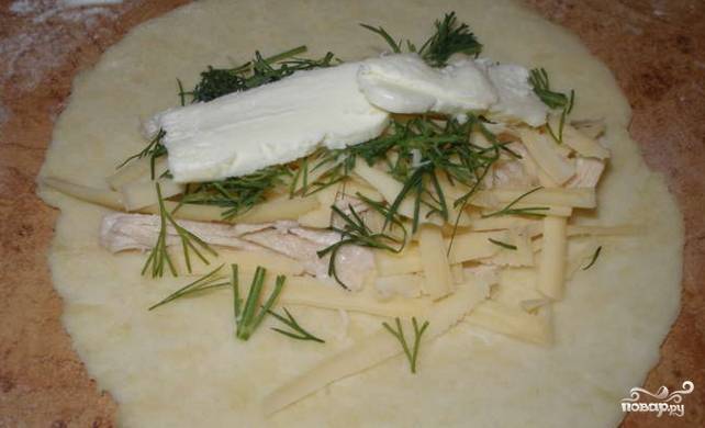 Раскатайте небольшие лепешки из теста, на них выкладывайте начинку: индейку, сыр, зелень и кусочек масла.