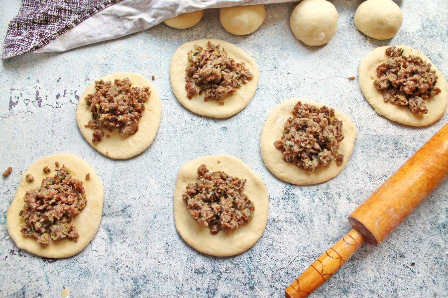Подошедшее тесто разделите на одинаковые части и сформируйте шарики. Накройте тесто и оставьте на 10-15 минут для подъема. Раскатайте каждую в лепешку и разложите начинку.
