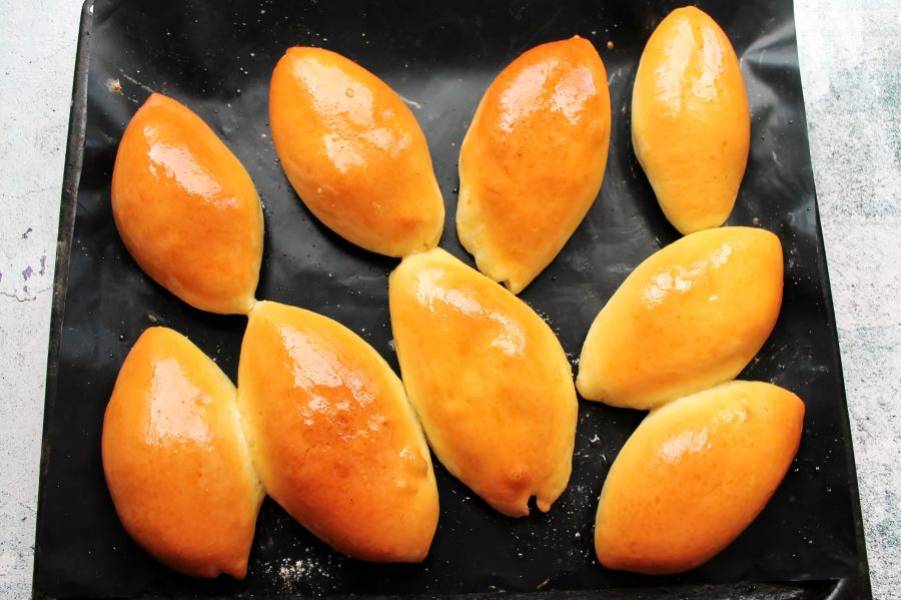 Сформируйте пирожки и выложите их на противень, смазанный растительным маслом швом вниз. Накройте противень и дайте им подойти в течение 10 минут для подъема. Смажьте сверху пирожки яйцом и выпекайте в горячей духовке при температуре 180 градусов в течение 20-25 минут, до готовности. Готовые пирожки достаньте, смажьте растительным маслом и, покрыв, дайте постоять 10 минут.