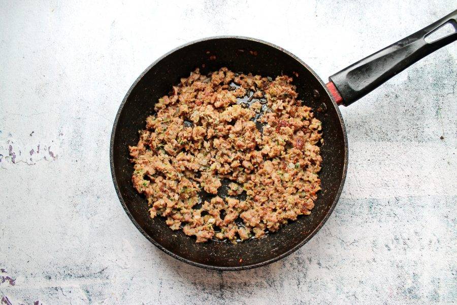 В сковороду налейте растительное масло и разогрейте на среднем огне. Выложите фарш и обжаривайте в течение 20 минут, перемешивая. Мясо должно приготовиться, а жидкость выпариться. Снимите сковороду с огня и остудите начинку.