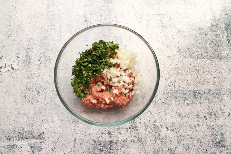 В миску выложите фарш, мелко нарезанные репчатый лук и укроп.