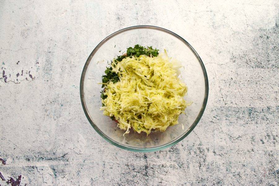 Кабачок очистите от кожуры и если есть семена, натрите на средней терке. Все посолите, поперчите и перемешайте.