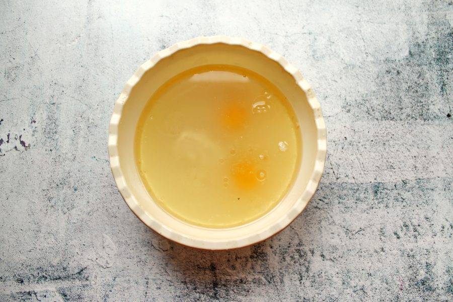 В миску влейте растительное масло, разбейте яйца и перемешайте до однородности.
