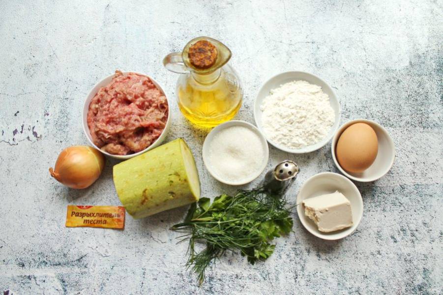 Подготовьте все необходимые ингредиенты для приготовления пирогов с кабачками и фаршем.