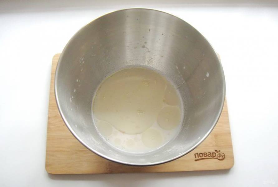 Приготовьте тесто. Для этого воду смешайте с молоком и подогрейте. Добавьте дрожжи, сахар, 3-4 столовые ложки рафинированного подсолнечного масла и соль. Я смешивала все ингредиенты в чаше миксера, но можно это сделать в любой глубокой посуде.