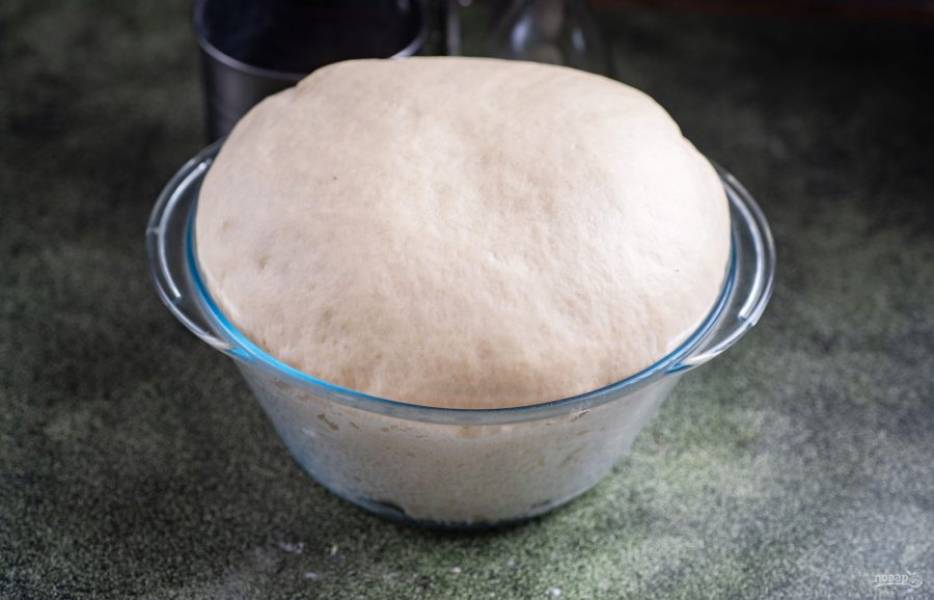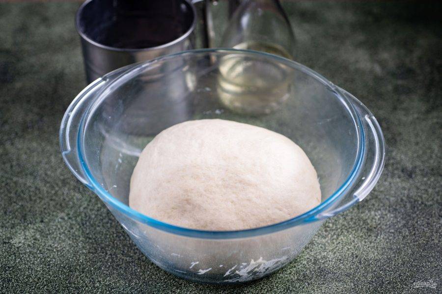 Итоговое тесто должно получиться после замеса мягким, к пальцам не должно прилипать. Округлите в миске тесто, миску накройте кухонным полотенцем и оставьте тесто подходить на 1-1,5 часа.