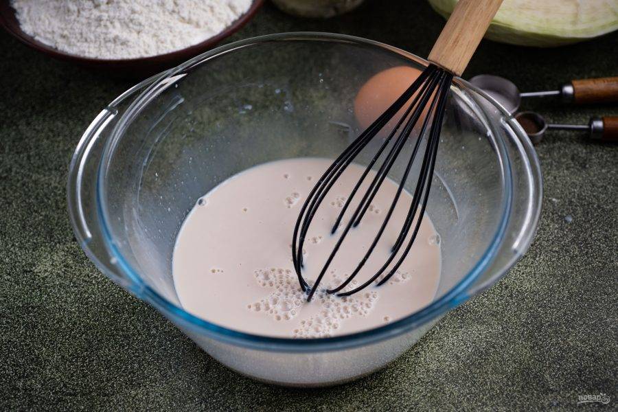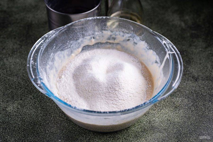 Активно перемешайте все венчиком до получения однородной смеси — это опара. Миску с опарой, накрыв кухонным полотенцем, поставьте в теплое место для созревания на 30 минут.