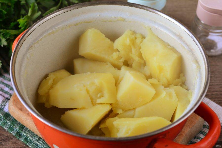 Приготовьте начинку. Почистите картошку и отварите в подсоленной воде 25 минут до мягкости. Затем горячую воду слейте.