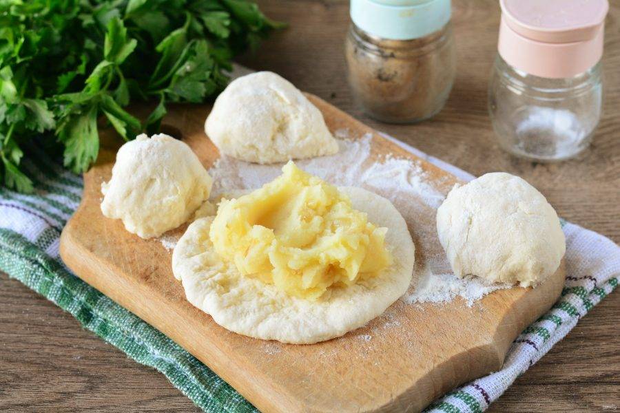 Тесто разделите на небольшие шарики, каждый придавите ладошкой или раскатайте слегка скалкой, выложите в центр 1 ложку картофельной начинки.