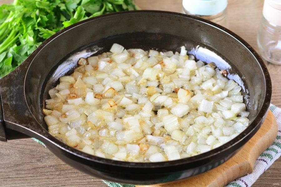 Почистите лук и нарежьте кубиками. Обжаривайте лук с добавлением растительного масла. Лук жарьте 5 минут до золотистого цвета.