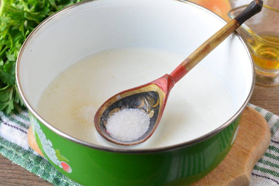 Всыпьте сахар и соль в простоквашу, размешайте.