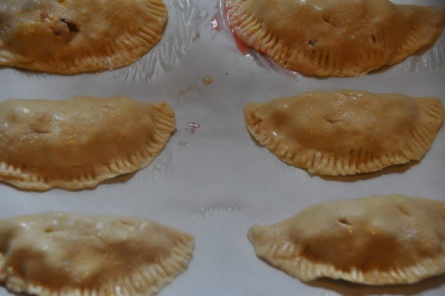 7. Выложить начинку на тесто и аккуратно завернуть пирожок. С помощью вилки защипить края и сделать небольшие отверстия сверху для выхода пара. Пирожки отправить на противень, смазанный маслом или застеленный пергаментом. При желании сверху можно смазать их желтком. Отправить в предварительно разогретую духовку минут на 30.