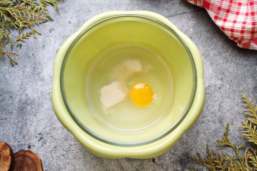 В миску налейте теплую воду, добавьте соль, сахар и выложите дрожжи. Разбейте в миску яйцо и перемешайте до однородности.