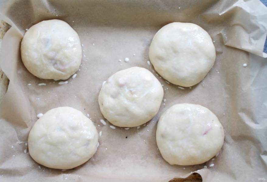 Сформируйте пирожки и выложите их на противень застеленный пергаментом и смазанный растительным маслом. Накройте противень и дайте постоять в теплом месте в течение 10-15 минут для подъема. Смажьте верх пирожков молоком.
