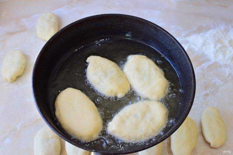 В горячей сковороде разогрейте большое количество растительного масла и обжарьте пирожки по 1-2 минуты с каждой стороны. Большой огонь делать не надо, чтобы пирожки успели прожариться, но не начали подгорать.