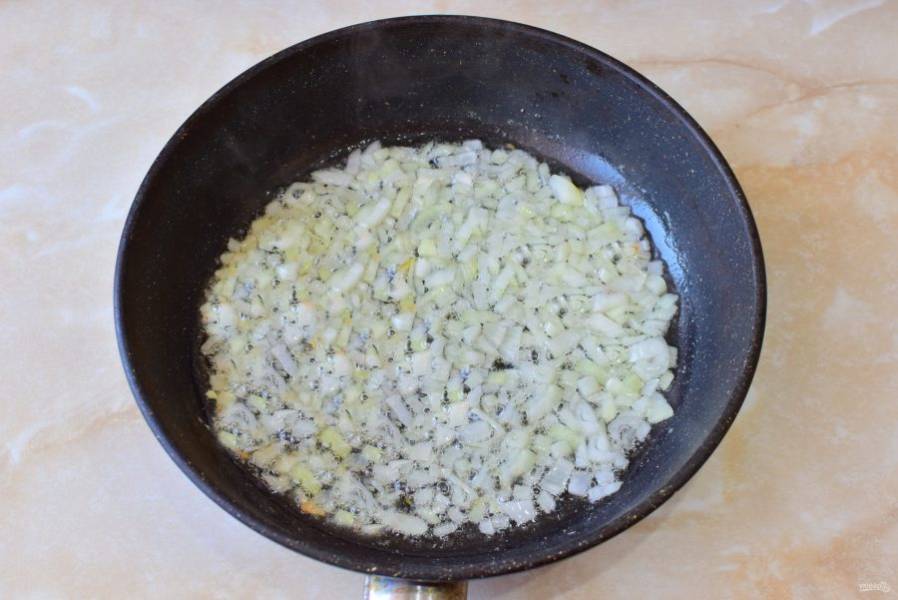 Для приготовления начинки обжарьте 2-3 минуты мелко нарезанный лук.